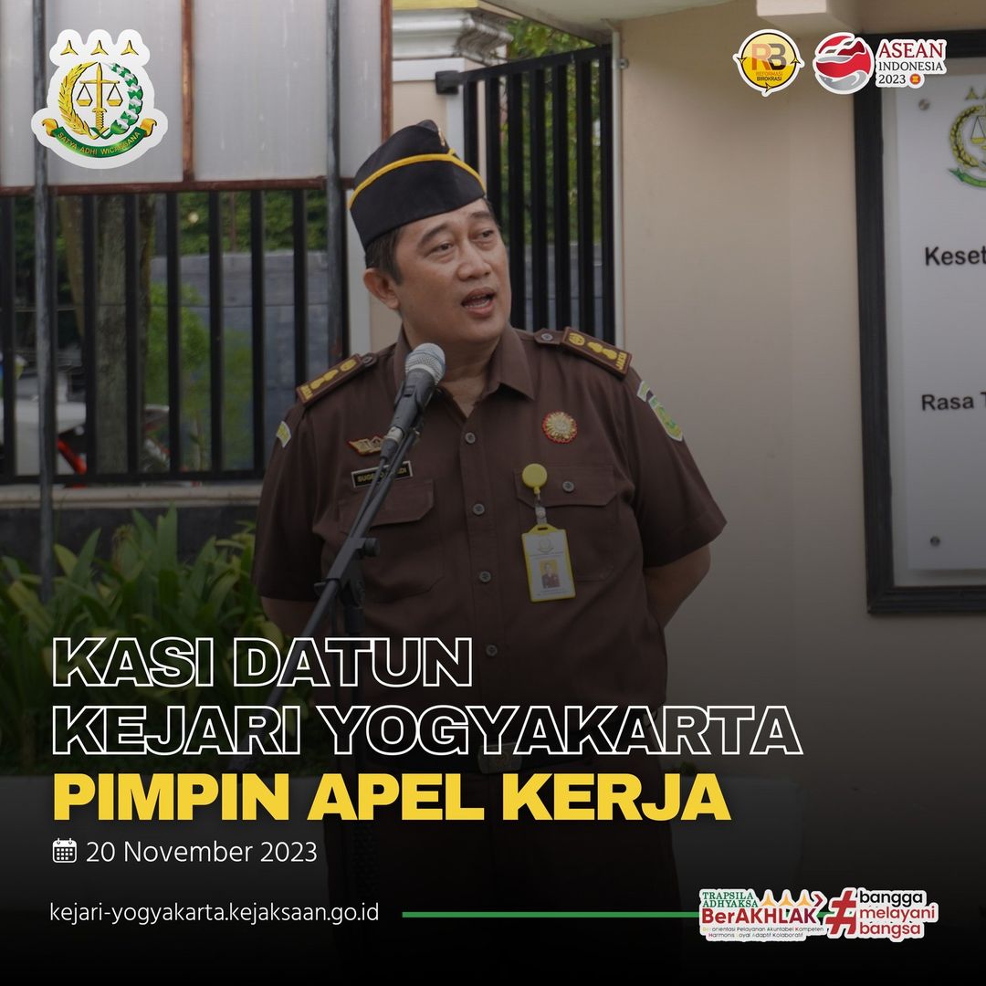 Kepala Seksi Perdata dan Tata Usaha Negara (Datun) Kejari Yogyakarta menjadi Penerima Apel Kerja Kejaksaan Negeri Yogyakarta yang diikuti oleh Para Kasi, Kasubagbin, Jaksa Fungsional beserta seluruh Pegawai dan Honorer pada Kejaksaan Negeri Yogyakarta bertempat di Halaman Kantor Kejaksaan Negeri Yogyakarta, Senin (20/11/2023)