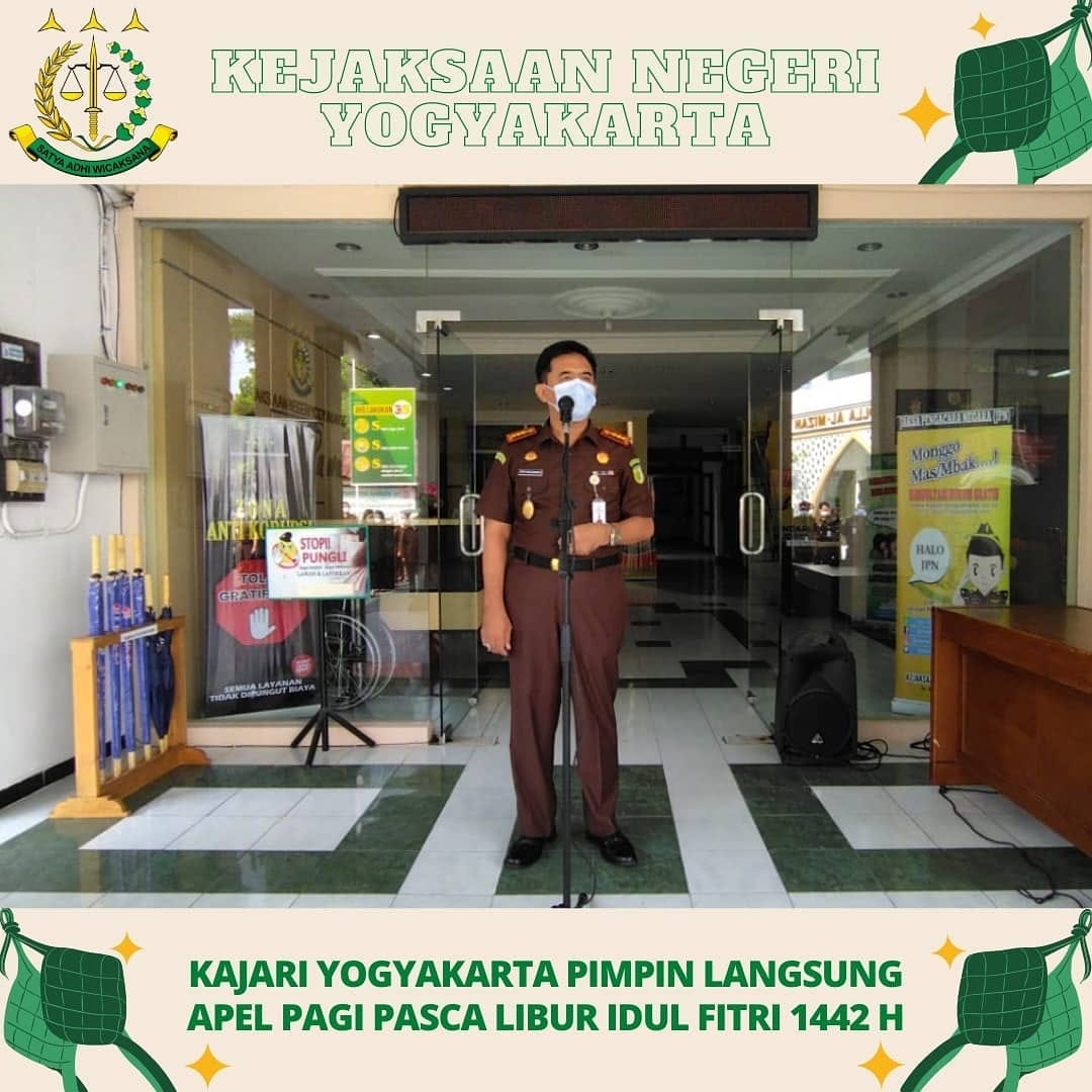 Mengawali hari pertama kerja pasca libur Idul Fitri 1442 H, Senin 17 Mei 2021 Kejaksaan Negeri Yogyakarta melaksanakan apel pagi pukul 08.00 WIB di Halaman Kantor Kejaksaan Negeri Yogyakarta, Jalan Sukonandi No.6. Apel pagi tersebut dipimpin langsung oleh Kepala Kejaksaan Negeri Yogyakarta, Bapak Gatot Guno Sembodo., SH., MH dan diikuti oleh para kasi & kasubbagbin, Jaksa fungsional, serta seluruh pegawai Kejari Yogyakarta. Dalam amanatnya Kajari Yogyakarta menyampaikan ” Taqabalallahu minna waminkum taqabbal yaa kariim”. Minal aidin wal faizin, mohon maaf lahir dan batin kepada seluruh jajarannya. Acara dilanjutkan dengan halal bi halal dengan tetap menerapkan protokol kesehatan dan ikrar halal bi halal dipimpin oleh Kasi Pidum Kejari Yogyakarta, Joko Wuryanto, SH., MH.