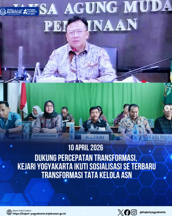 Yogyakarta, 10 April 2026 di laksanakan Sosialisasi Surat Edaran tentang Pelaksanaan Tugas Kedinasan bagi Aparatur Sipil Negara di Lingkungan Kejaksaan Republik Indonesia dalam rangka Mendukung Percepatan Transformasi Tata Kelola Penyelenggaraan Pemerintahan di ikuti oleh Kepala Kejaksaan Negeri Yogyakarta Hartono,S.H.,M.H. , Kasubagbin, Para Kasi serta staff bidang terkait.