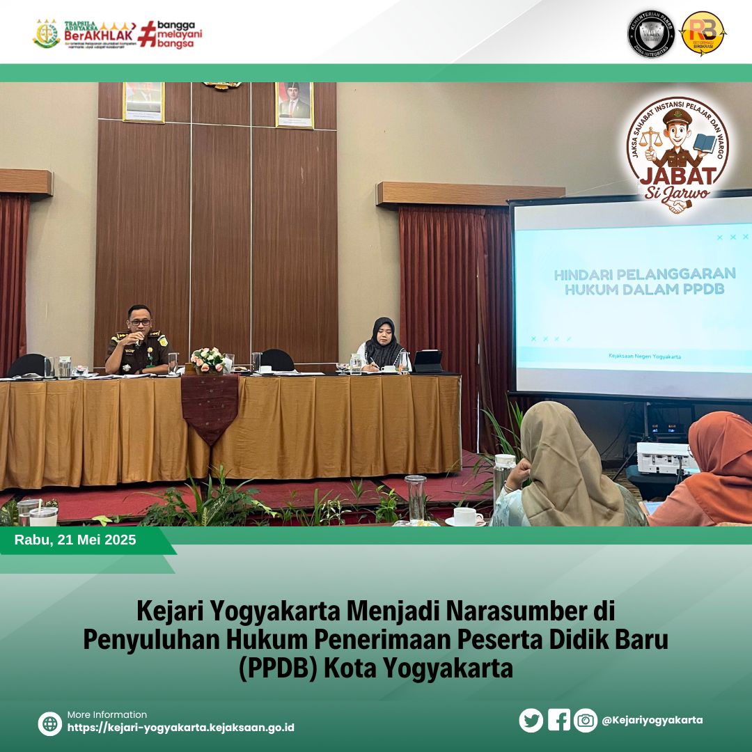 Kejaksaan Negeri Yogyakarta menjadi Narasumber, dalam hal ini adalah Kepala Seksi Pengelolaan barang Bukti dan Barang Rampasan (PB3R), Surono, S.H., M.H., pada kegiatan Jaksa Masuk Sekolah (JMS) yang bertempat di SMP Negeri 14 Yogyakarta, Kamis 30 November 2023.