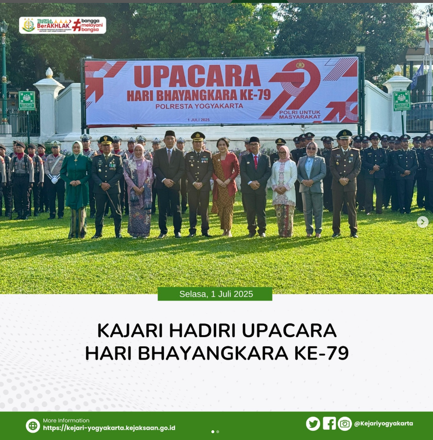 Yogyakarta, 1 Juli 2025 – Kajari Yogyakarta, Suroto, S.H., M.H., menghadiri Upacara dan Syukuran Hari Bhayangkara ke-79 yang digelar di Lapangan Balai Kota Yogyakarta.