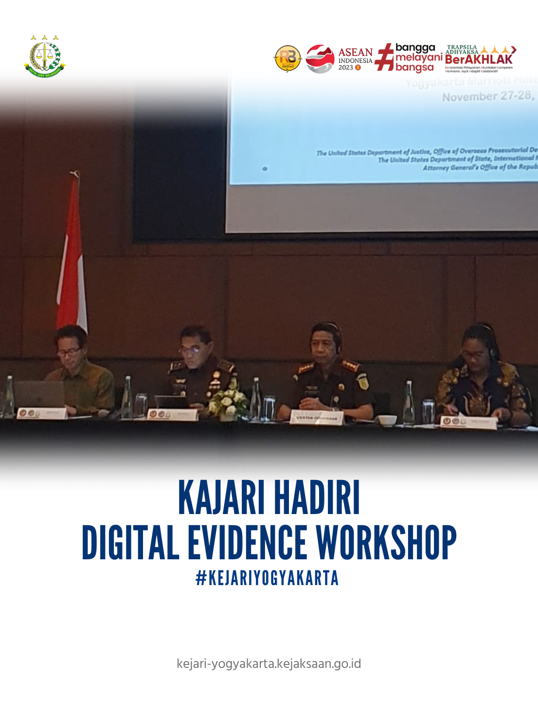 Yogyakarta, Senin 27 November 2023 Kepala Kejaksaan Negeri Yogyakarta, Saptana Setya Budi, S.H., M.H., Digital Evidence Workshop bersama dengan beberapa Pejabat Publik lainnya yaitu, Kapus DTF Heri Jerman, OPDAT Mrs. Tomika Patterson (Penasehat Hukum Tetap Departemen Kehakiman A.S. Kedubes Amerika Serikat, OPDAT Mrs. Bruce Miyake, Mary Stewart Agen Khusus FBI, Kabid DTF Suwanda, Kajari Sleman, Kajari Bantul, dan Peserta Diklat OPDAT berjumlah 30 orang. Kegiatan ini dilaksanakan di Hotel JW Marriot Yogyakarta.