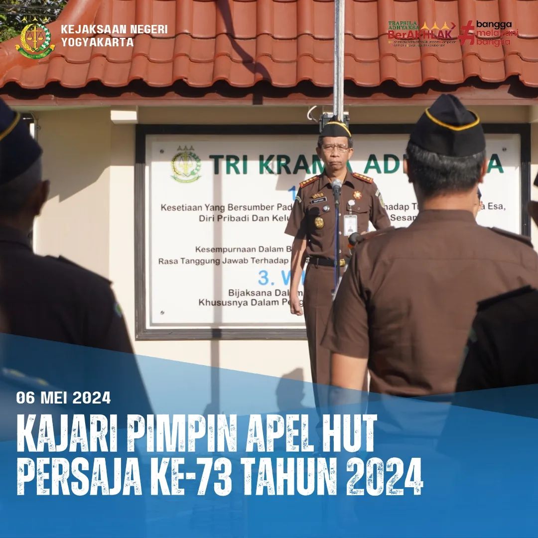 Kajari Yogyakarta pimpin apel kerja dalam rangka memperingati Hari Persatuan Jaksa Indonesia (Persaja) Ke-73 Tahun 2024, bertempat di Halaman Kantor Kejaksaan Negeri Yogyakarta, Senin (06/05/2024).