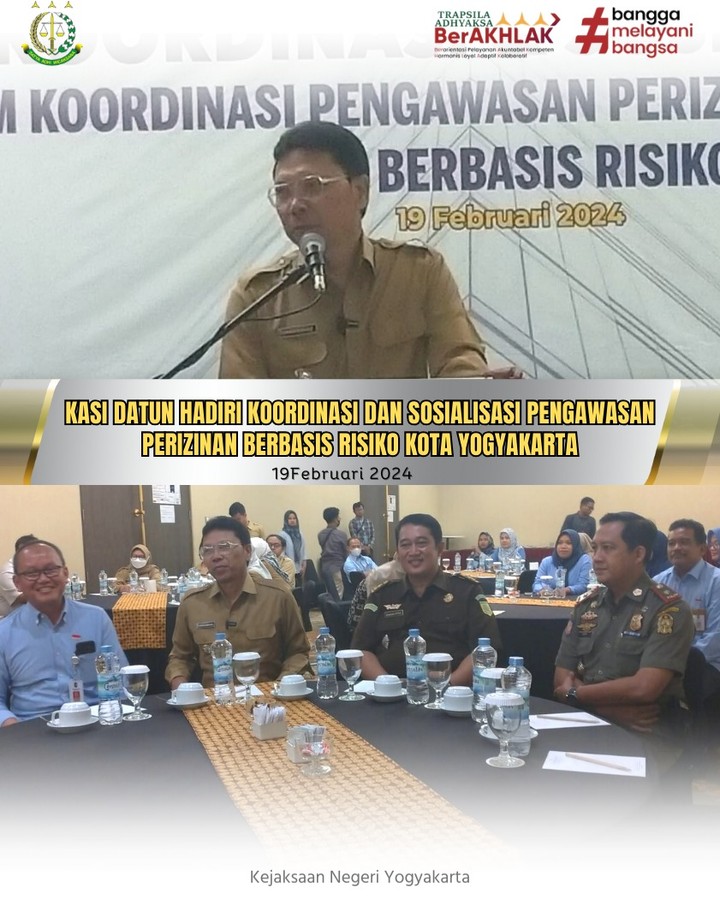Kasi Datun Sugeng Riyadi,S.H menghadiri acara Sosialisasi Pengawasan Perizinan Berbasis Risiko bertempat di Hotel Grand Kangen pada Senin (19/02/2024). Di hadiri oleh PJ Walikota Yogyakarta Singgih Raharjo, S.H., M.Ed. Tujuan dari acara ini adalah mensosialisasikan berbagai regulasi dan isu-isu aktual terkait implementasi pengawasan perizinan berusaha berbasis risiko, update informasi dan pemahaman secara komprehensif terkait dengan implementasi pengawasan perizinan berusaha berbasis risiko dan tersampaikannya informasi yang menambah literasi pelaku usaha dalam hal kewajiban menyampaikan Laporan Kegiatan Penanaman Modal (LKPM) dan pengawasan penanaman di OSS RBA.