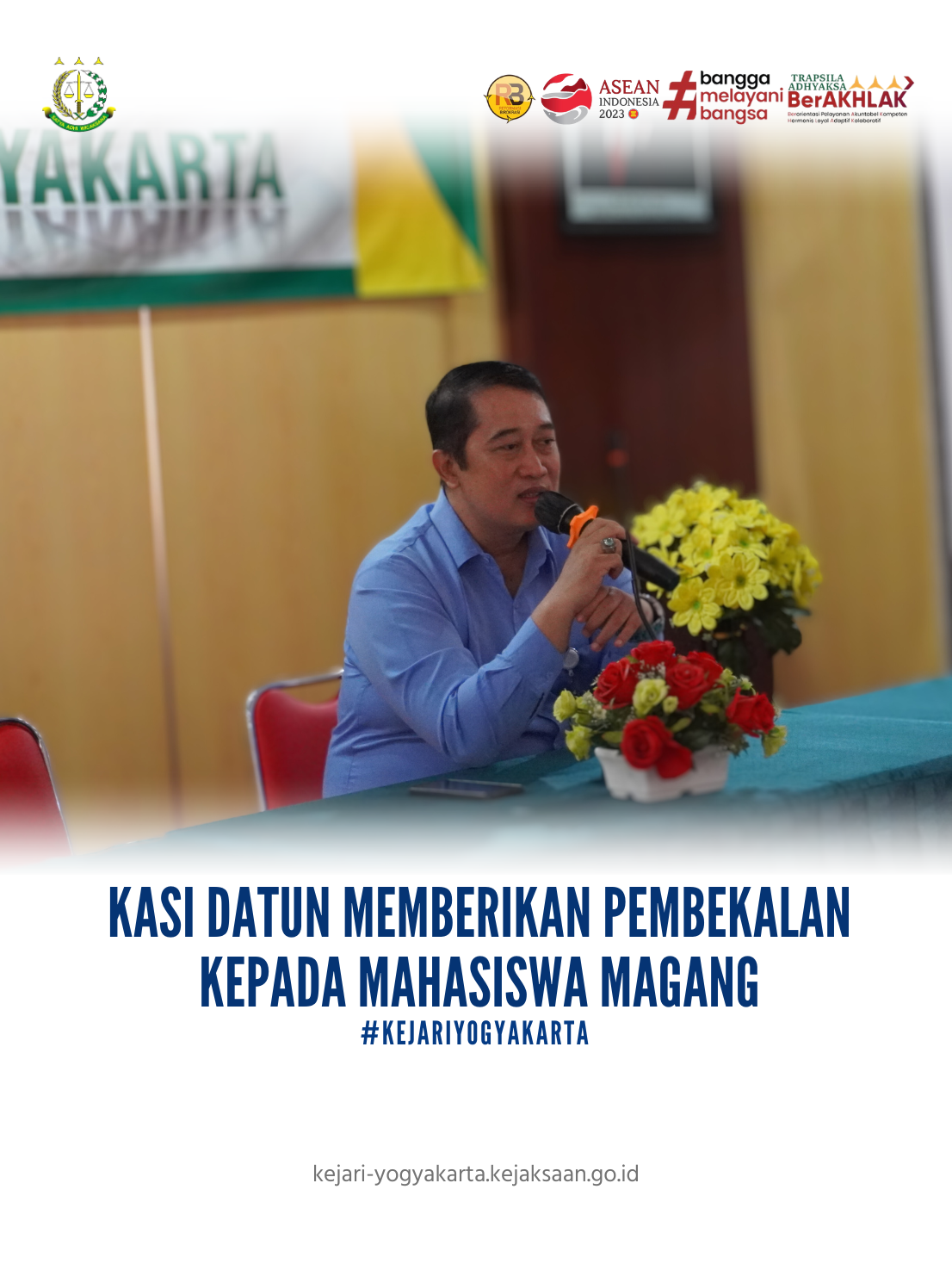 Kejaksaan Negeri Yogyakarta melaksanakan kegiatan pembekalan mahasiswa magang bertempat di Aula Kejari Yogyakarta, Kamis (30/11/2023) Kegiatan yang diikuti oleh mahasiswa dari Universitas Muhammadyah Yogyakarta (UMY), Universitas Islam Indonesia (UII), dan Universitas Negeri Yogyakarta (UNY) ini merupakan layanan yang diberikan Kejari Yogyakarta kepada mahasiswa bernama Sinau Kerjo (SIJO). Dalam kegiatan ini Kepala Seksi Perdata dan Tata Usaha Negara (Datun) Kejari Yogyakarta, Sugeng Riyadi, S.H., bertindak sebagai narasumber memberikan penjelasan mengenai pentingnya peran Bidang Perdata dan Tata Usaha Negara dalam menjalankan tugas dan fungsi Kejaksaan.