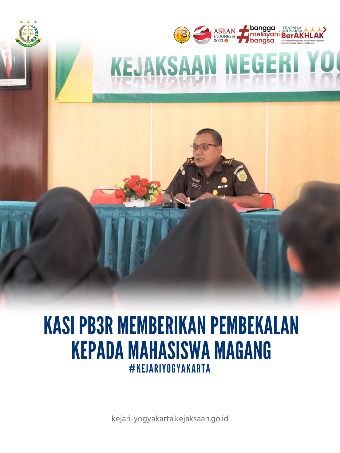 Kejaksaan Negeri Yogyakarta melaksanakan kegiatan pembekalan mahasiswa magang bertempat di Aula Kejari Yogyakarta, Kamis (30/11/2023) Kegiatan yang diikuti oleh mahasiswa dari Universitas Muhammadyah Yogyakarta (UMY) dan Universitas Islam Indonesia (UII), dan Universitas Negeri Yogyakarta (UNY), ini merupakan layanan yang diberikan Kejari Yogyakarta kepada mahasiswa bernama Sinau Kerjo (SIJO). Dalam kegiatan ini Kepala Seksi Pengelolaan Barang Bukti dan Barang Rampasan, Surono, S.H., M.H., bertindak sebagai narasumber memberikan penjelasan mengenai pentingnya peran Bidang Pengelolaan Barang Bukti dan Barang Rampasan dalam menjalankan tugas dan fungsi Kejaksaan.