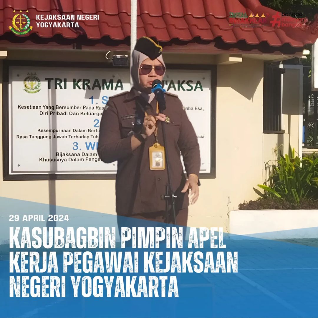 Kepala Sub Bagian Pembinaan Kejaksaan Negeri Yogyakarta pimpin Apel Kerja bertempat di halaman Kantor Kejaksaan Negeri Yogyakarta, diikuti para Kepala Seksi, Jaksa Fungsional beserta seluruh Pegawai dan PPNPN, Senin (29/04/2024)