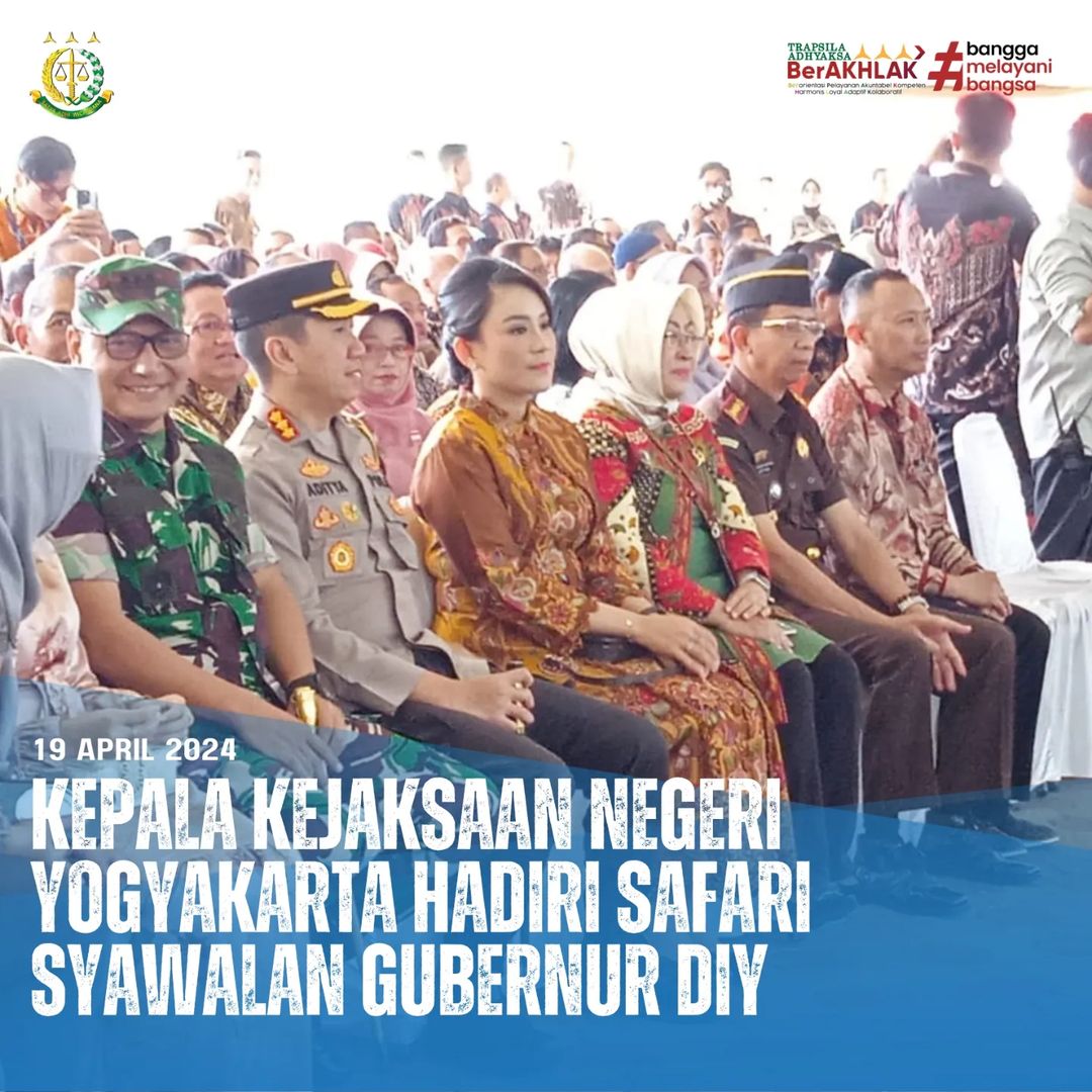 Jumat (19/04/2024), Kepala Kejaksaan Negeri Yogyakarta didampingi Kepala Seksi Intelijen, Kepala Seksi PB3R dan Kepala Sub Bagian Pembinaan menghadiri dalam kegiatan Safari Syawalan Gubernur D.I.Yogyakarta yang diselenggarakan di Halaman Balai Kota Yogyakarta.