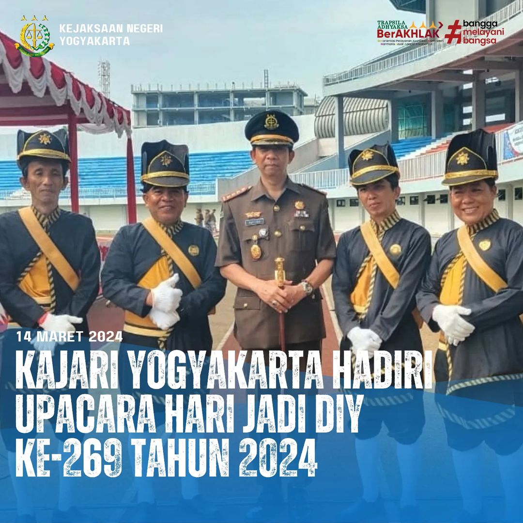 Kepala Kejaksaan Negeri Yogyakarta hadiri Upacara Hari Jadi DIY ke-269 dengan tema “Maju Sejahtera Berkelanjutan Dijiwai Kebudayaan dan Keistimewaan” yang diselenggarakan oleh Pemda DIY bertempat di Stadion Mandala Krida Jl. Kenari, Semaki, Umbulharjo, Kota Yogyakarta, Rabu (13/03/2024)