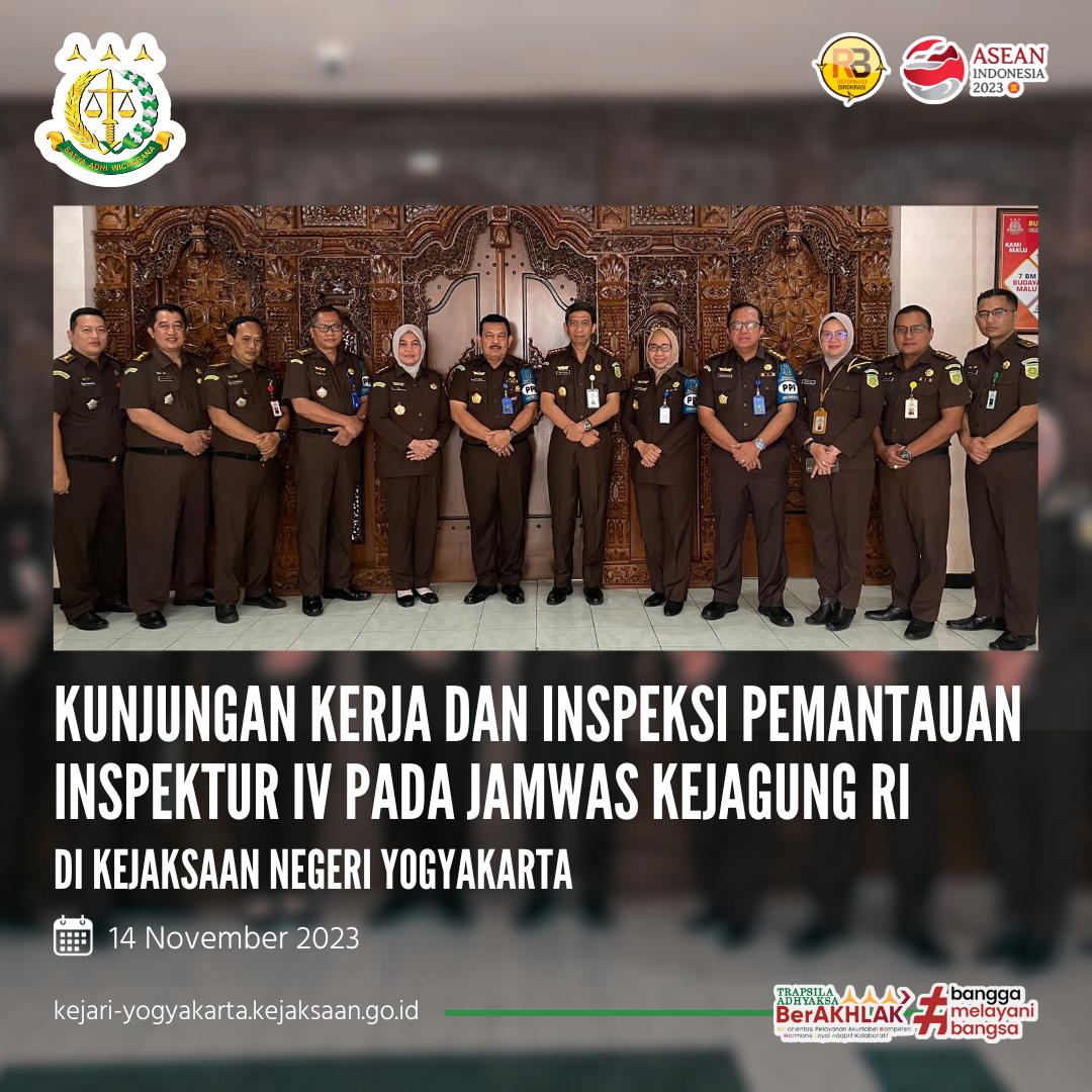 Selasa (14/11/2023), Kejaksaan Negeri Yogyakarta menerima kunjungan kerja Inspektur IV pada Jaksa Agung Muda Bidang Pengawasan Edyward Kaban, S.H., M.H., dalam rangka Pemantauan Hasil Inspeksi Umum pada Wilayah Kejaksaan Negeri Yogyakarta.