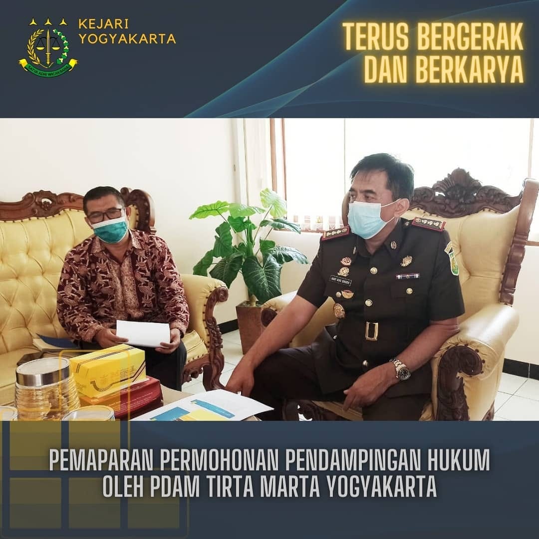 Bertempat di Ruang Kerja Kajari Yogyakarta telah dilaksanakan pemaparan terhadap permohonan pendampingan hukum pekerjaan penggantian pipa distribusi utama jenis Asbestos Cement Pipe (ACP) ke High Density Polyethylene (HDPE) dari Jembatan Sayidan sampai dengan Gembira Loka Perumda PDAM Tirta Marta Yogyakarta Tahun Anggaran 2021 yang dibiayai Pemerintah Kota Yogyakarta sebagai penyertaan modal kepada Perumda PDAM Tirta Marta Yogyakarta