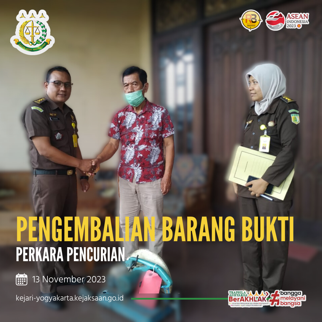 Senin 13 November 2023, Pengembalian Barang Bukti oleh Kejaksaan Negeri Yogyakarta, dalam hal ini adalah perkara pencurian berupa: 1 (satu) Unit Mesin Pemotong Logam Warna Biru Merk Wakita 220-230v 50-60hz 2000v; , kepada Bapak dr. Kasirun Kasim Putranto,