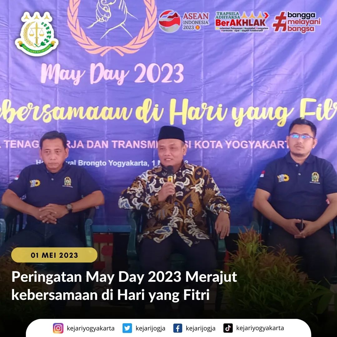 Kepala Seksi Intelijen Kejari Yogyakarta menjadi salah satu pembicara dalam acara Peringatan May Day 2023 dengan tema “Merajut kebersamaan di Hari yang Fitri” yang diselenggarakan oleh Dinsosnakertrans Kota Yogyakarta bertempat di Hotel Royal Brongto Jl. Suryodiningratan No.26, Suryodiningratan, Kec. Mantrijeron, Kota Yogyakarta, Senin (01/05/2023)