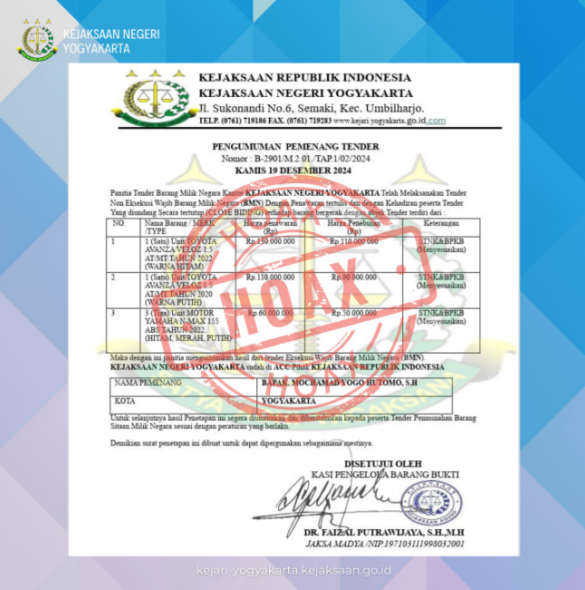 Telah beredar di media sosial informasi tentang lelang kendaraan mobil dan motor yang mengatasnamakan Kejaksaan Negeri Yogyakarta. Dalam informasi tersebut tercantum daftar barang yang dilelang beserta nama-nama pemenang lelang